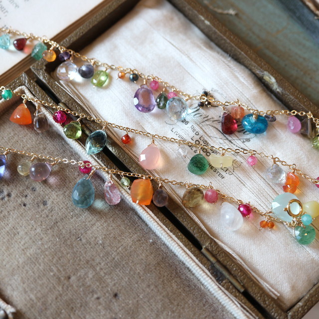 繊細にカットされた高品質な天然石など、素材にはこだわりを持って製作しており、金属部分は主に「K14gf(ゴールドフィルド)」を使用しています。
